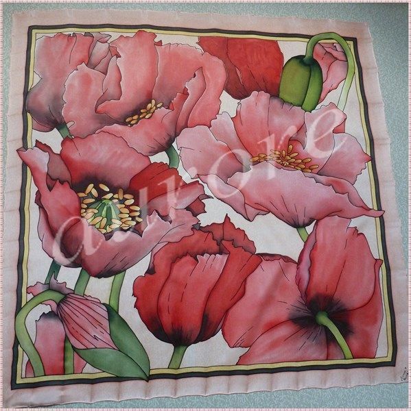 Carée de soie avec des pavots en prés-sertie (soie déjà faite par une machine) il me reste que la couleurs.