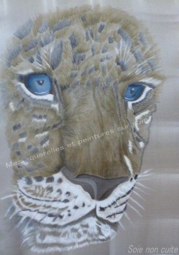 Bonjour, voilà la suite et la fin du léopard en aquarelle sur soie, je le laisse telle quelle j'ai peur d'en faire trop par là suite. Il n'est cuit en étuve encore, donc les couleurs sont terne.
